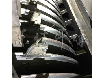 空心軸上密集排列著楔型中空漿葉,熱介質(zhì)經(jīng)空心軸流經(jīng)漿葉。單位有效容積內(nèi)傳熱面積很大,熱介質(zhì)溫度從-40℃到320℃,可以是水蒸汽,也可以是液體型:如熱水、導(dǎo)熱油等。間接傳導(dǎo)加熱,沒有攜帶空氣帶走熱量,熱量均用來加熱物料。熱量損失僅為通過器體保溫層向環(huán)境的散熱。楔型漿葉傳熱面具有自清潔功能。物料顆粒與楔型面的相對(duì)運(yùn)動(dòng)產(chǎn)生洗刷作用,能夠洗刷掉楔型面上附著物料,使運(yùn)轉(zhuǎn)中一直保持著清潔的傳熱面。漿葉干燥機(jī)的殼體為Ω型,殼體內(nèi)一般安排二到四根空心攪拌軸。殼體有密封端蓋與上蓋,防止物料粉塵外泄而充分發(fā)揮作用。
